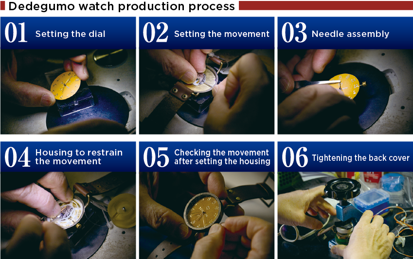 First, the metal frame of the watch case is bent, brazed, and polished. Then, the electroplating work is outsourced, and upon its return, the movement is combined with the internally manufactured dial, and the hands are assembled in the order of hour, minute, and second hands. This is the most difficult part. The minute hand must be perfectly accurate.
